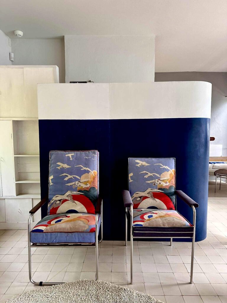 Em linha com as sugestões vindas do universo marítimo, um dos tapetes que Gray desenhou para a E 1027 exibia ondas estilizadas, um compasso e uma boia. Na varanda da fachada que abre para o mar está pendurado um espécime do corpo flutuante.