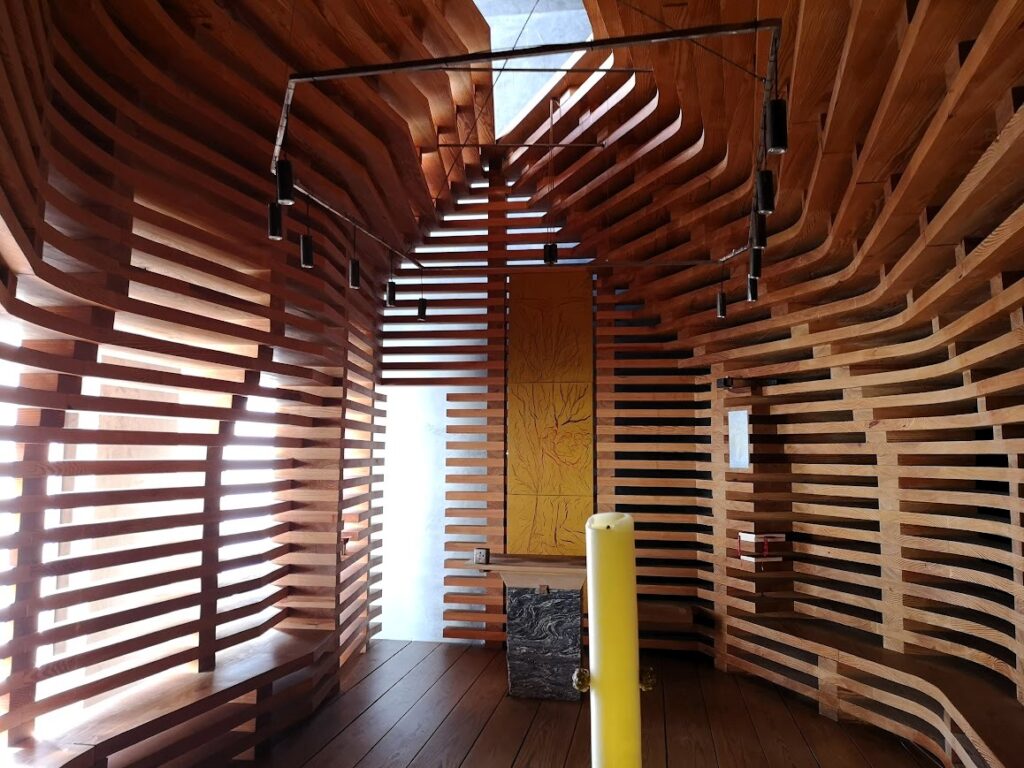 No referido seminário atraía‑nos a Capela da Árvore da Vida, uma joia do trabalho com madeira. Terminada em 2012, na sua construção operou‑se por encaixes, não há pregos nem parafusos ou dobradiças. O respetivo projeto teve assinatura do gabinete Cerejeira Fontes Arquitetos, que contou com a colaboração de Asbjørn Andresen, artista plástico norueguês. Despojado, o templo acolhe, ainda assim, algumas obras de Ilda David. Usam‑no os seminaristas e só abre ao público uma hora por semana. Visto que ali reinam o bom gosto e a harmonia, a estética e a simplicidade, a atmosfera incentiva à oração, à introspeção, a persistir no recolhimento. Para quem cultue a traça singular, este agnistério é um must.