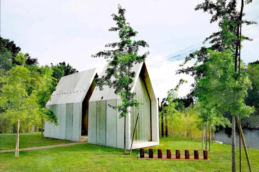 Graças a uma resposta rápida e simpática de Maria Inês Barreto, do serviço de comunicação do grupo DST, pude ir à capelita de recolhimento e meditação existente no parque empresarial do conglomerado, nos arredores de Braga. De 2020, foi ideada pelo arquiteto Nuno Capa. Formam‑na dois volumes, feitos de betão aparente, cada um deles com um vidro na extremidade que fecha o conjunto. Num desses volumes há um banco de alto padrão estético, no outro reina, suspenso, um crucifixo. Minimalista e proporcionado, tal petit bijou da arquitetura tem a sua valia estética reforçada por branquejar no meio de um tapete de relva e também contra o verde da mata próxima.