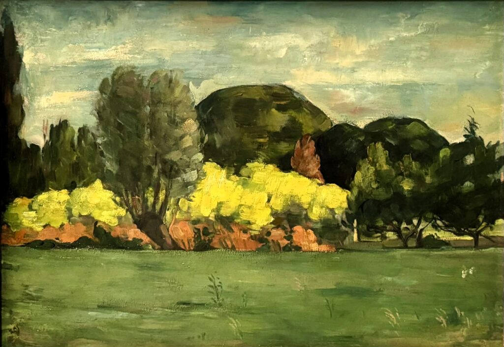 Tanto eu como a Jūratė notámos que, pelo punho do artista, as cores quentes da moradia e do piso de terra batida fazem cantar os verdes da natureza. O jogo dos planos horizontais com a verticalidade das árvores e o toque de pincel que agitou as folhas delas seduziram‑nos.