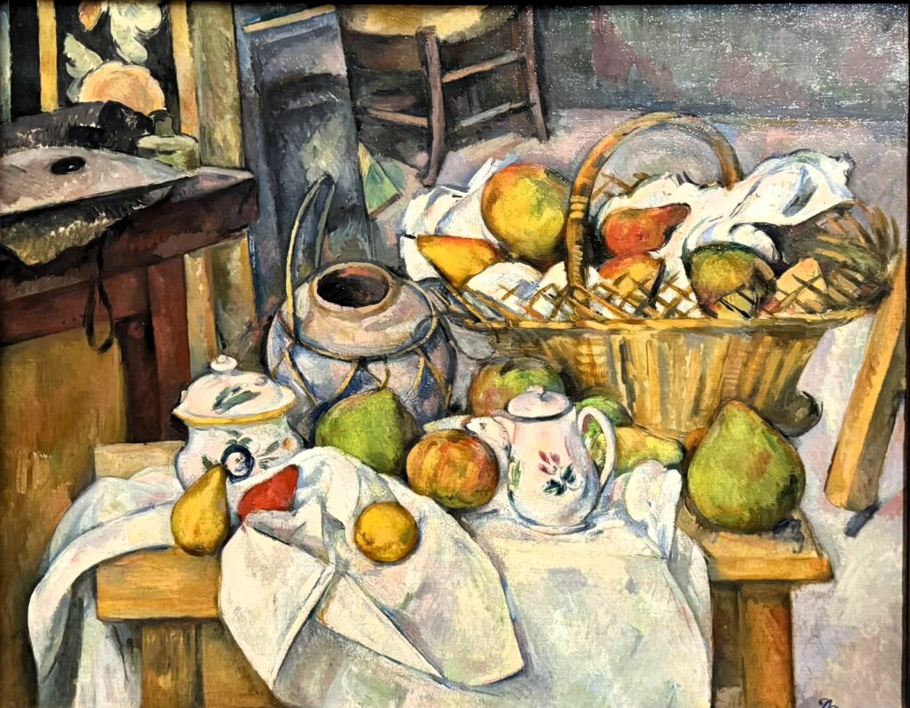 A fim de preparar A Mesa de Cozinha (1888‑1890), Cezanne serviu‑se de moedas para inclinar alguns elementos e assim alterar a perspetiva; a imagem surge carregada, o cesto da fruta talvez acabe no chão, o jarro está descaído, as peças de fruta encontram‑se aqui e ali, mas a composição é bonita e não deixa de ser harmoniosa.
