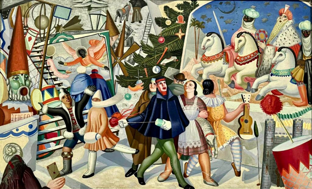 2. Eis Maruja Mallo, na tradução que fiz dum pedaço do texto atinente a Máscara y compás constante do sítio web do Museu Rainha Sofia[1]: