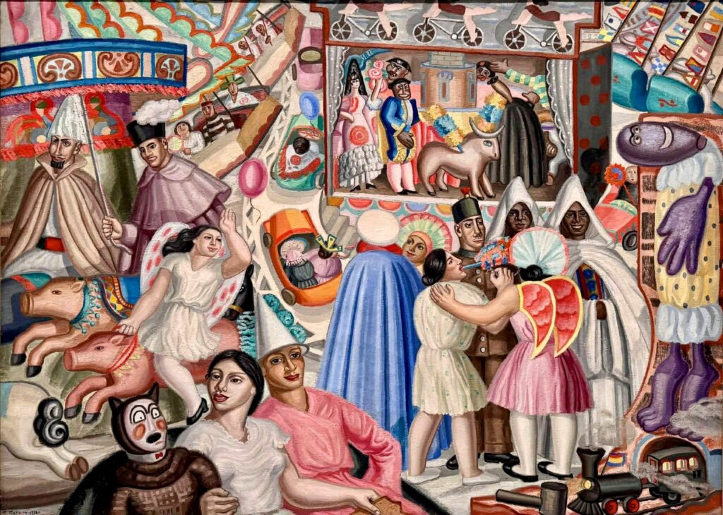 Procedo assim por diversos motivos: adorei alguns trabalhos de Mallo, sobretudo os que integravam as séries Verbenas (festas populares) e La religión del trabajo; Mallo é espanhola, várias composições suas radicam na vida em Espanha e eu, nas viagens e nos escritos que delas decorrem, privilegio o autor e a coisa local; a autora merece loas em razão daquilo que, por via da arte, fez em prol da condição da mulher; era livre até ao tutano e eu admiro pessoas livres; muitos nunca terão ouvido falar da criadora em causa, uso o ensejo para dar a conhecer o respetivo labor.