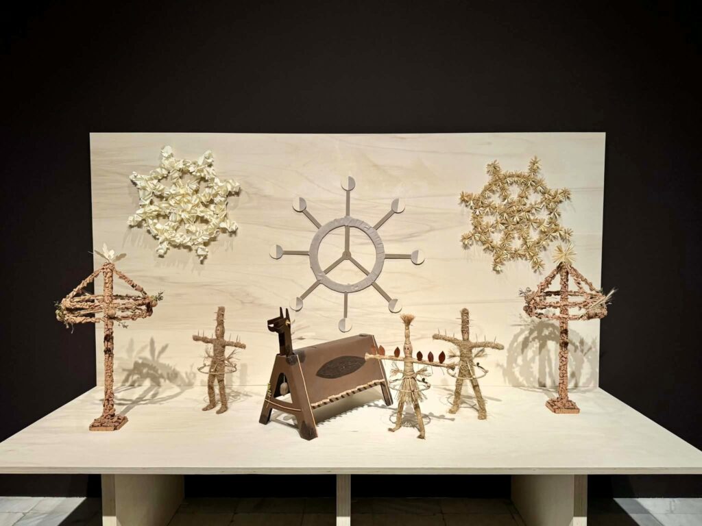 Nos anos trinta, Maruja Mallo vestiu pele de cenógrafa e de figurinista, mormente no âmbito do teatro de fantoches e do teatro de marionetas. Porque evidenciava a versatilidade da artista, o segmento de Máscara e Compasso dedicado à sua intervenção no meio teatral merecia apreço. Cativou‑me, acima de tudo, o toque de arte popular das imitações — feitas por um artesão, Álvaro Martínez Leiro, a partir de uma fotografia — de adereços que Mallo concebeu para Clavileño, um espetáculo de ópera e de bailado que acabaria por não ter honras de palco.