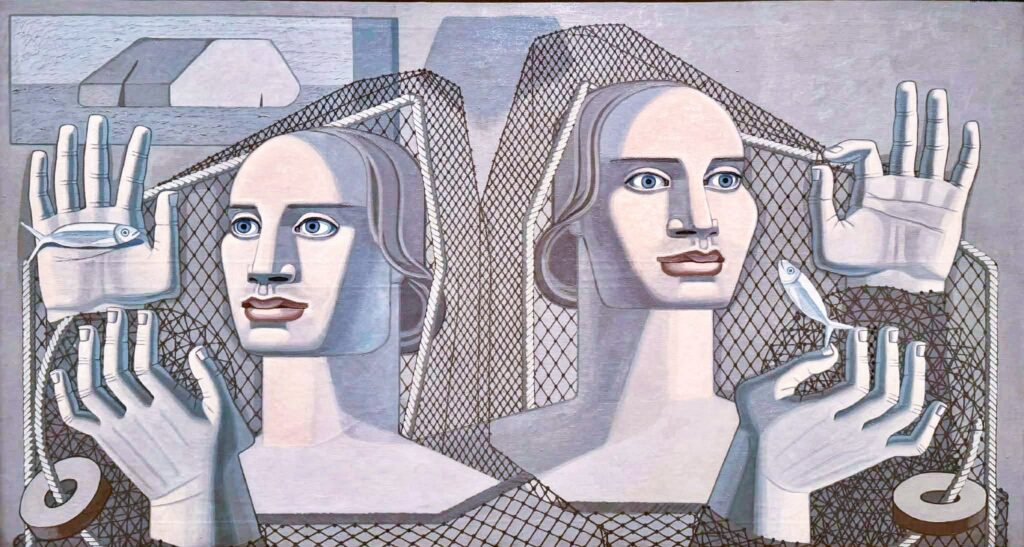 Num par de quadros relacionados com a faina da pesca, Arquitectura humana e Mensaje del mar, ambos de 1937, estranhei a androginia dos rostos. A masculinização da figura feminina e a criação de ambiguidade no que toca ao género poderiam advir da necessidade de mostrar as mulheres como criaturas dotadas de forte constituição física[3]. No que respeita ao título do primeiro, Mallo acertou em cheio, não me lembro doutra imagem com apresentação tão arquitetónica de um ser humano.