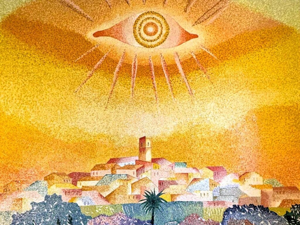 O mosaico, de tesselas, encontra‑se na parede fundeira. Representa Saint‑Paul‑de‑Vence e o generoso sol que a ilumina. Cativou‑me em razão do contraste entre os tons claros do núcleo histórico da povoação e aqueloutros, mais escuros, das zonas verdes que a circundam.