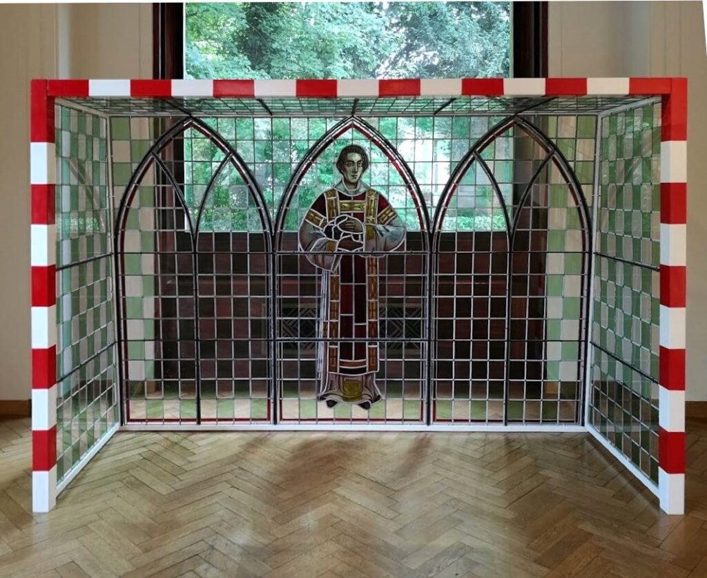 A obra que espoletou o nosso interesse por Icons foi St. Stephanus, de Wim Delvoye, uma baliza inverosímil, com dimensões que a aproximam daqueloutras próprias do futsal e do andebol. Delvoye pintou a trave e os postes de vermelho e branco, e substituiu a rede por vitrais. No que atrás fecha a baliza, traçou arcos ogivais e figurou Santo Estêvão. Embora saiba que a arte é o reino da dissonância e da combinação improvável, senti surpresa.